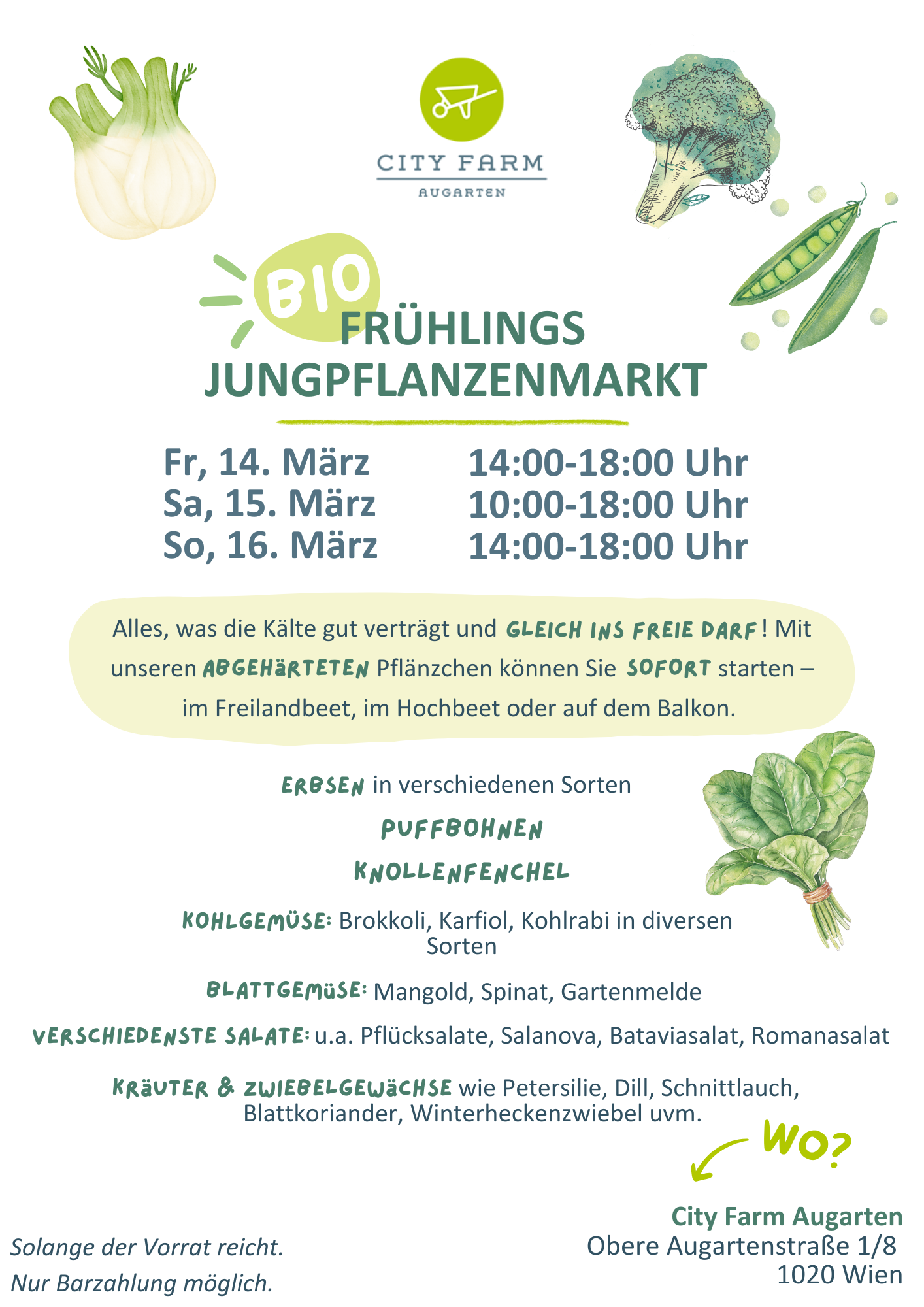 “Im Frühling keine Zeit verlieren”: Schon jetzt dürfen die ersten Gemüsepflänzchen ins Freie – vorausgesetzt sie sind ausreichend robust und kommen noch mit Kälte zurecht. Bei uns in der City Farm bekommst du die passenden Bio-Jungpflänzchen, mit denen du in deinen (Hoch)beeten und Balkonkistchen starten kannst. Ein Expert:innen-Team vor Ort berät dich gern bei deiner Auswahl.