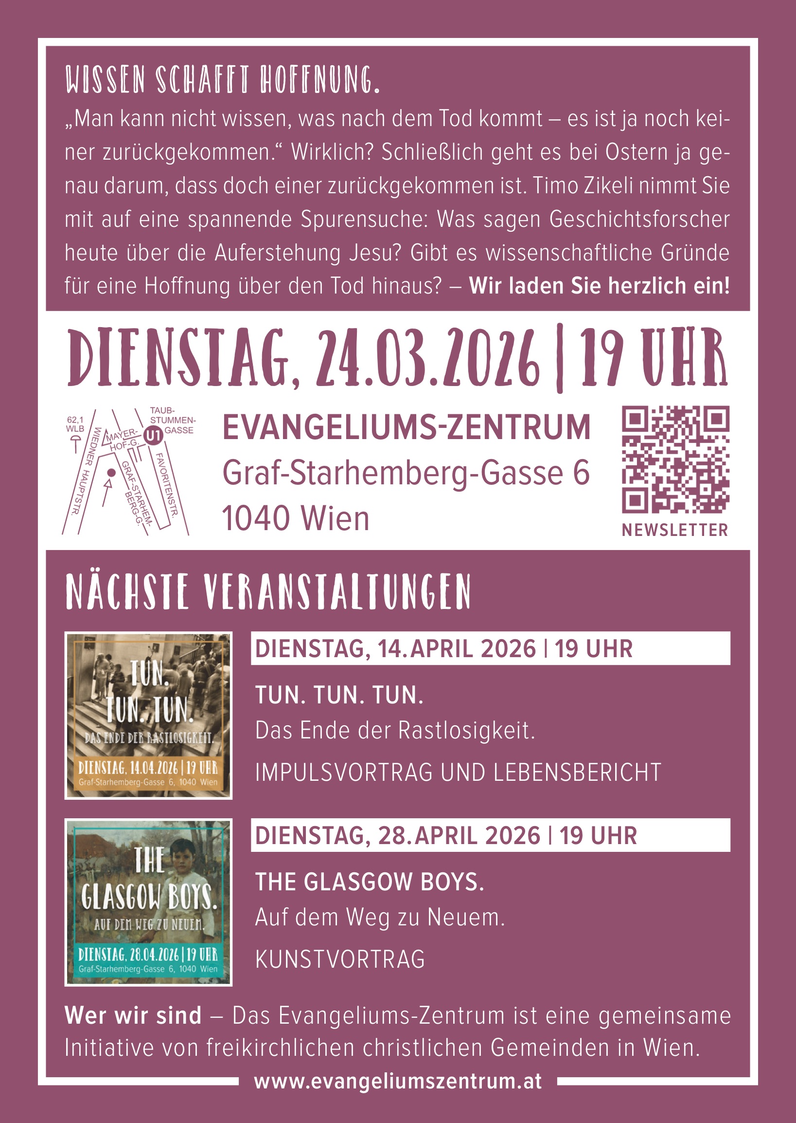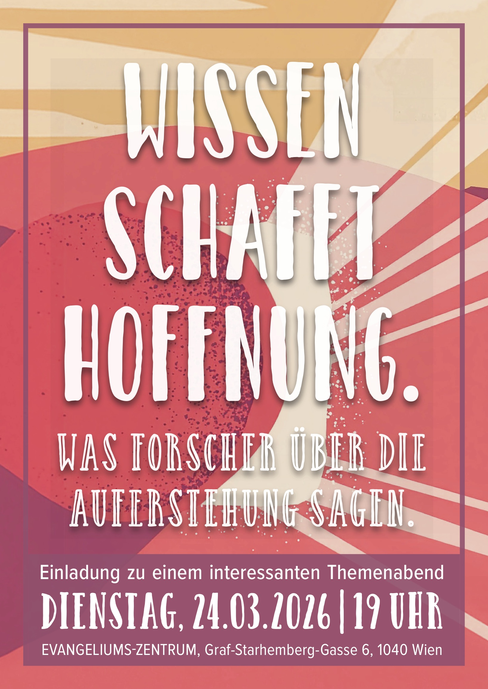 "Man kann nicht wissen, was nach dem Tod kommt - es ist ja noch keiner zurückgekommen." Wirklich? Schließlich geht es bei Ostern ja genau darum, dass doch einer zurückgekommen ist. Der Vortragende nimmt Sie mit auf eine spannende Spurensuche: Was sagen Geschichtsforscher heute über die Auferstehung Jesu? Gibt es wissenschaftliche Gründe für eine Hoffnung über den Tod hinaus? - Wir laden Sie herzlich ein!