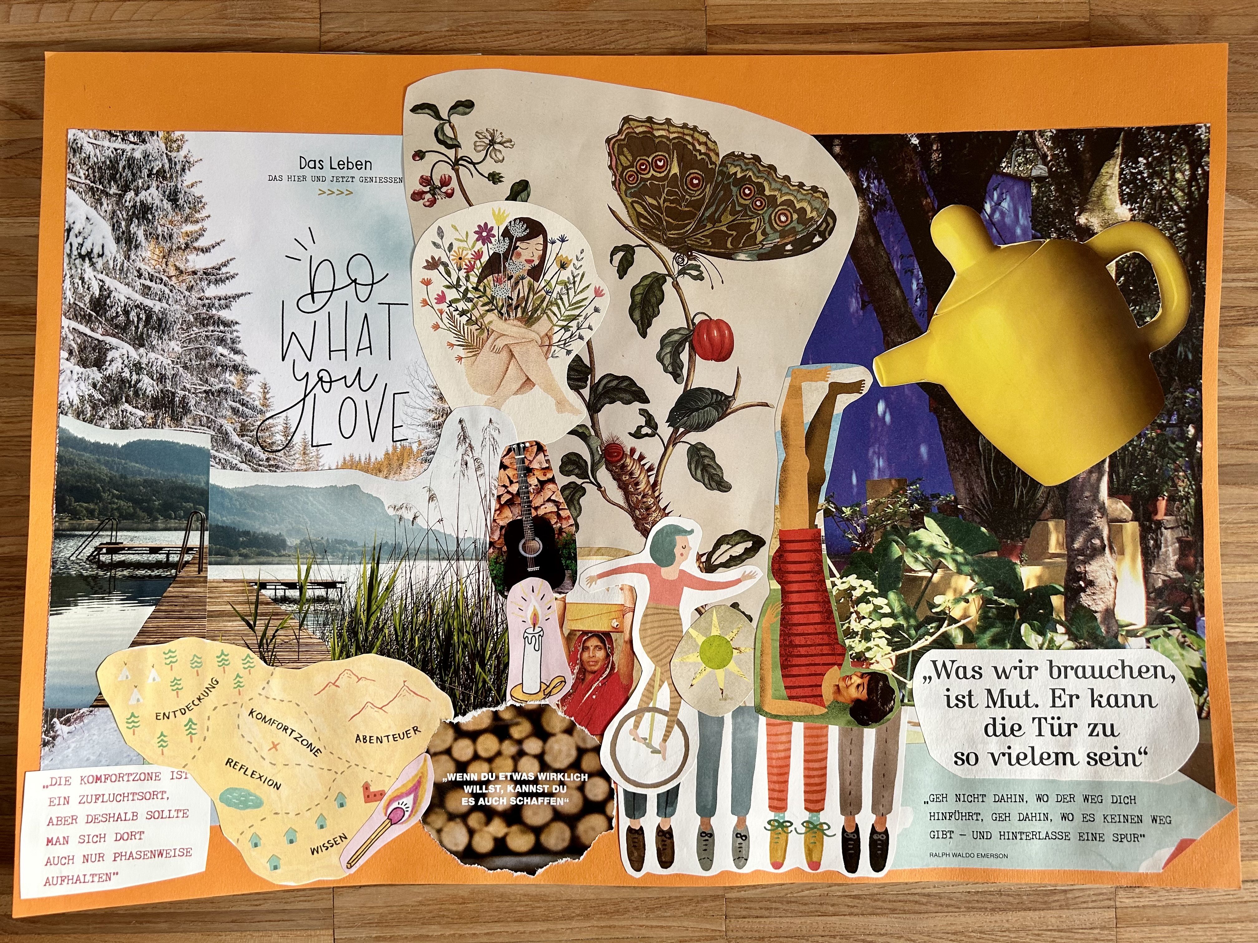 In einem sehr intuitiven, kreativen Prozess begegnest du deinen wahren Herzenswünschen und gestaltest sie in einem Bild. Dein Visionboard wird damit zu einem ganz persönlichen Begleiter, der deine Emotionen weckt und dich regelmäßig daran erinnert und motiviert, deine Träume Schritt für Schritt zu verwirklichen.