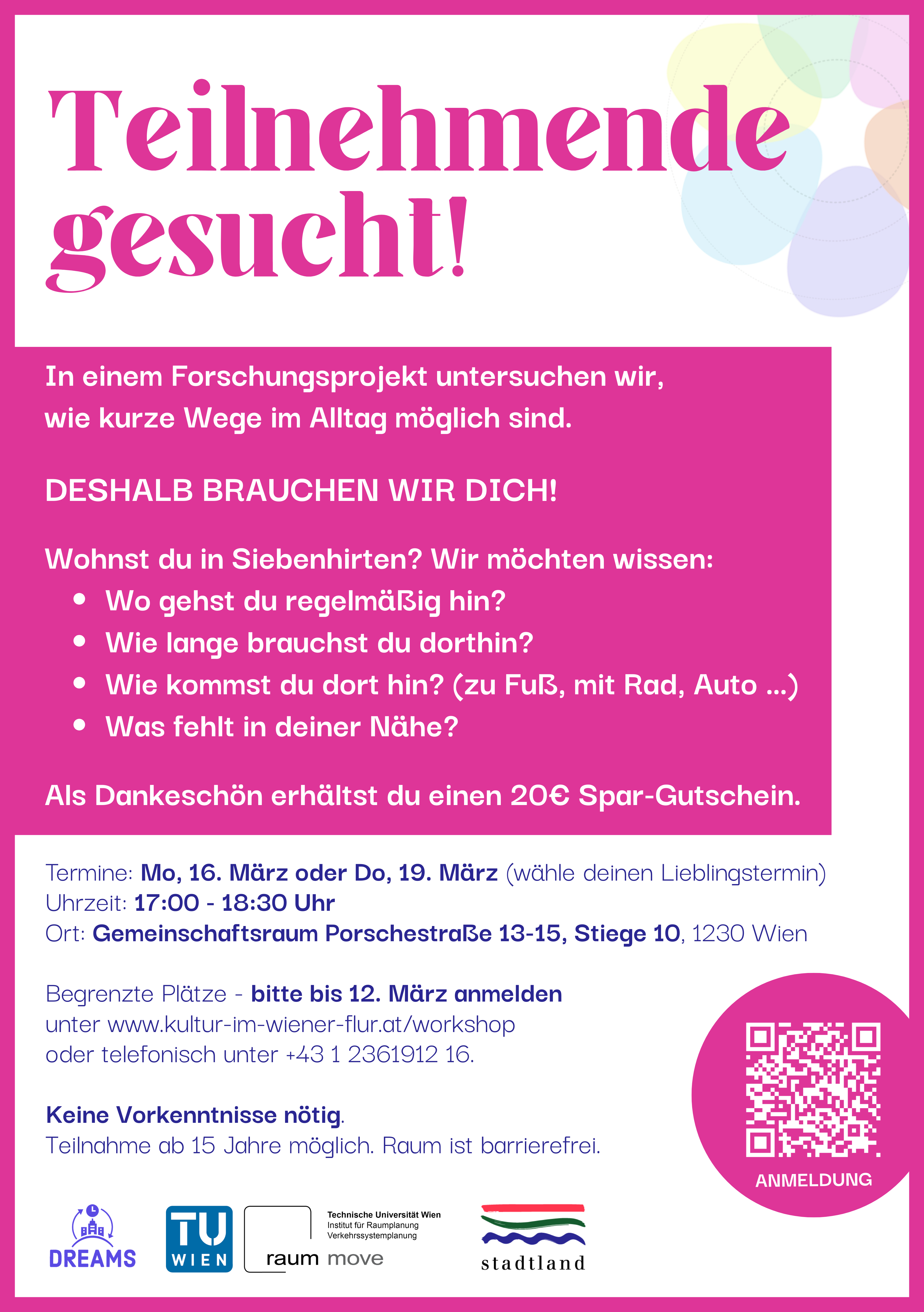 Wir veranstalten zwei Workshops im März, bei denen wir von euch wissen wollen, welche Wege ihr im Alltag zurücklegt. Als Dankeschön gibt es einen 20€ Einkaufsgutschein. Alle Infos zu den Workshops findest du unter Veranstaltungen.