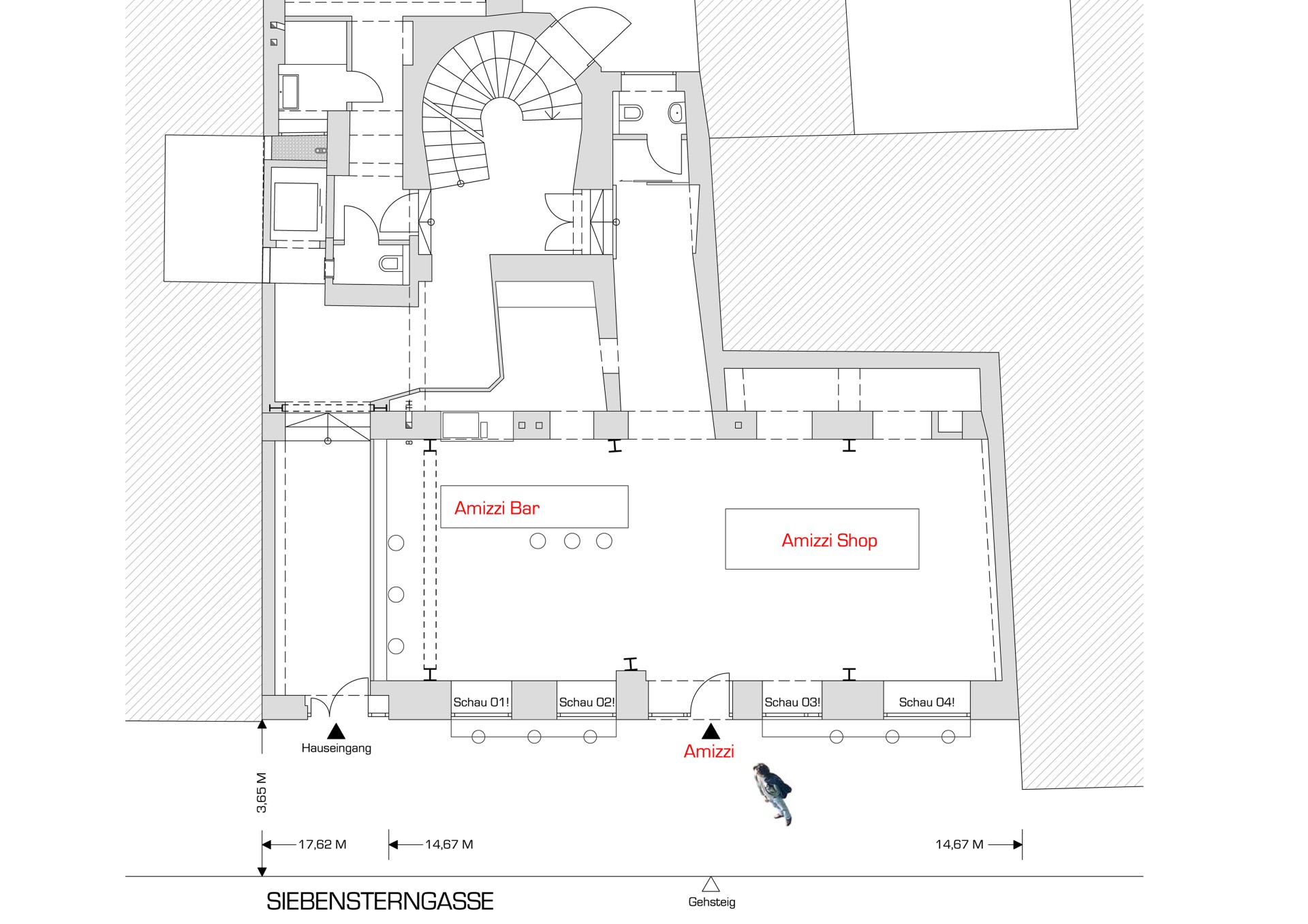 Das Praktische: Wir übernehmen den Verkauf für dich. Kassensystem und Verkäufer:innen vor Ort sind im Preis inkludiert. Durch das Café auf der anderen Seite kommt laufend neues Publikum ins Lokal, das bei Kaffee oder Aperitivo auch deine Produkte entdeckt – genau diese Mischung macht Amizzi besonders.