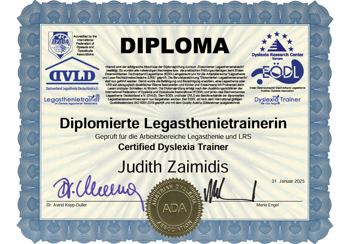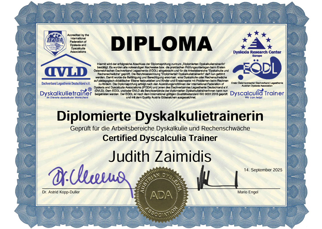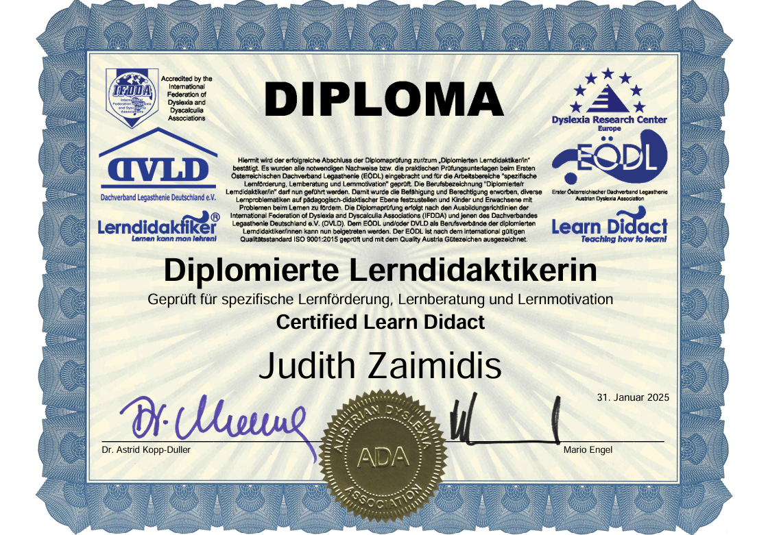Abgeschlossene Ausbildungen: Diplomierte Legasthenietrainerin Diplomierte Dyskalkulietrainerin Diplomierte Lerndidaktikerin