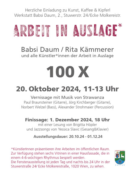Babsi Daum und Rita Kämmerer in der Stuwerstraße 24/Ecke Molkereistraße, 1020 Wien eröffnet wird. Zum 100. Mal Kunst, Kaffee und Kipferl. Egal ob