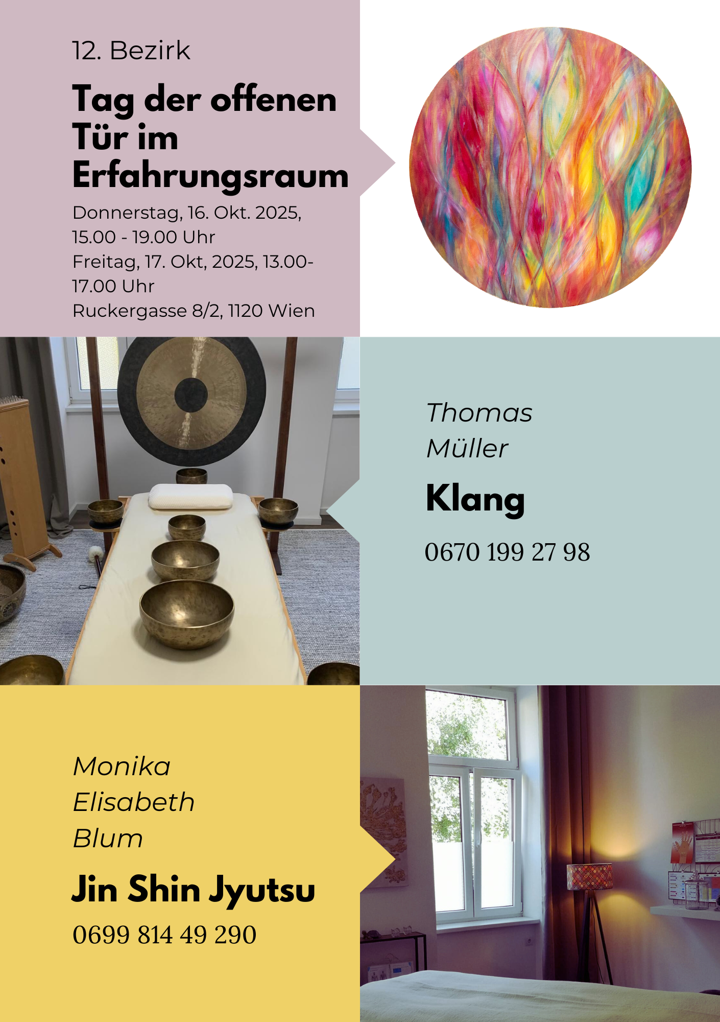 Herzlich laden wir euch ein, unseren Erfahrungsraum im 12. Bezirk zu besuchen. Wir informieren über Klanganwendungen und Jin Shin Jyutsu und geben einen Einblick in unseren Raum. Wir freuen uns auf