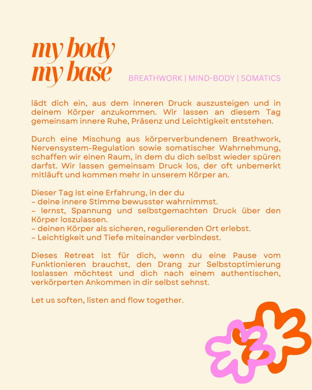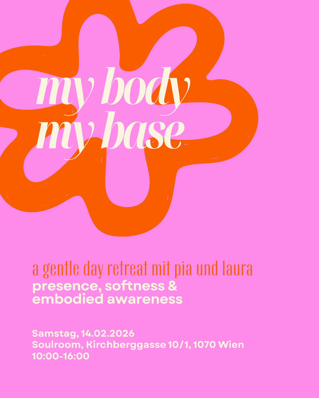 My Body My Base lädt dich ein, aus innerem Druck auszusteigen und in deinem Körper anzukommen. Gemeinsam schaffen wir an diesem Tag Raum für Ruhe, Präsenz und Leichtigkeit.