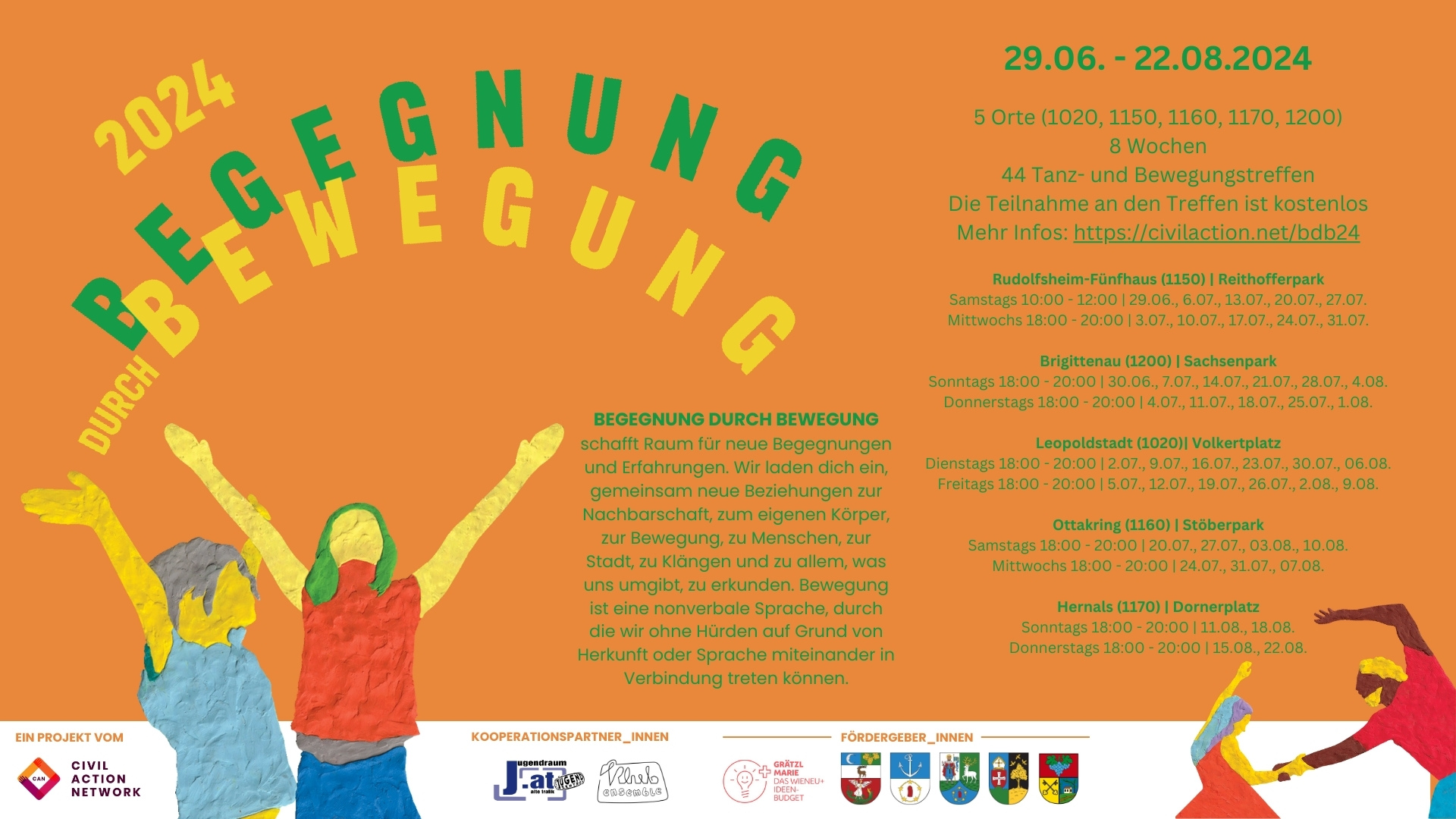 Im Sommer 2024 findet wieder unser jährliches und saisonales partizipatives Bewegungsprojekt statt! Wir, das sind die Menschen vom Civil Action Network, einem kleinen gemeinnützigen Verein in Wien: https://civilaction.net/de/