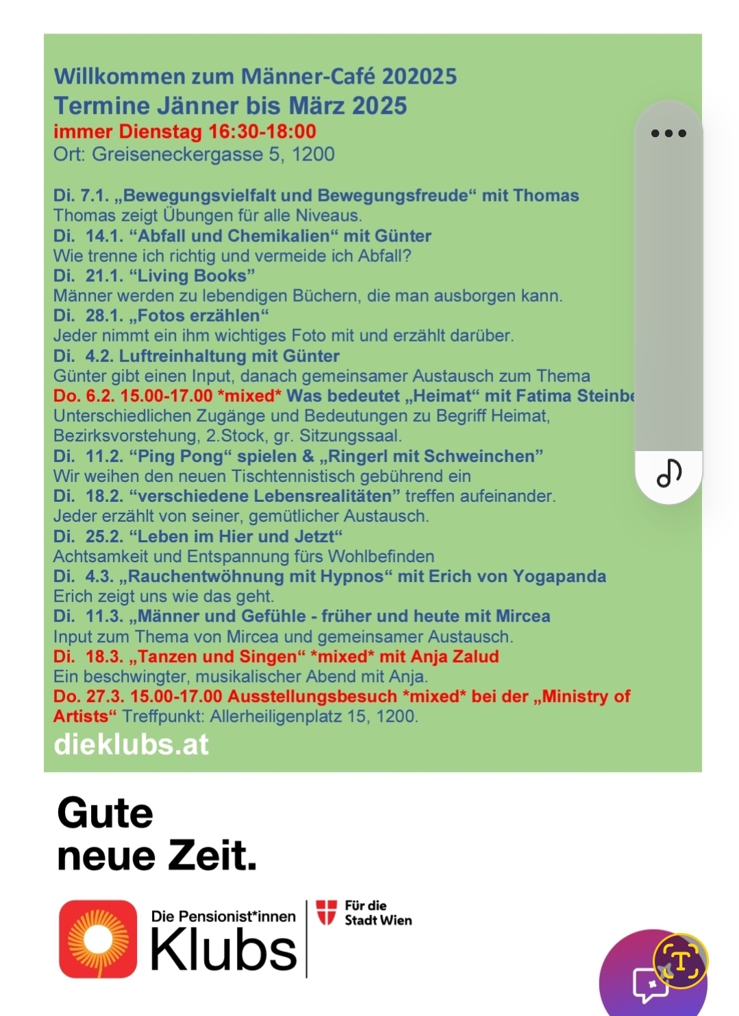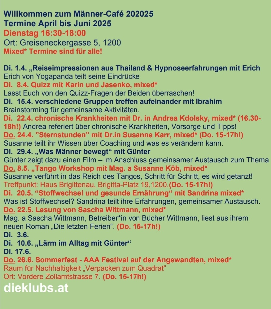 Das wöchentliche Männer-Café in der Brigittenau lädt jung und alt zum gemeinsamen Austausch, zur Selbsthilfe und zur Förderung körperlicher und geistiger Gesundheit ein. Die Themen kommen von den Männern. In gemütlicher Runde geht es bei den Treffen um Themen wie Psychologie, Spiritualität, Männlichkeit, Familie, Freundschaft, Dating, Beziehungen, körperliche und psychische Gesundheit, Freizeit, Bewegung sowie Ernährung.