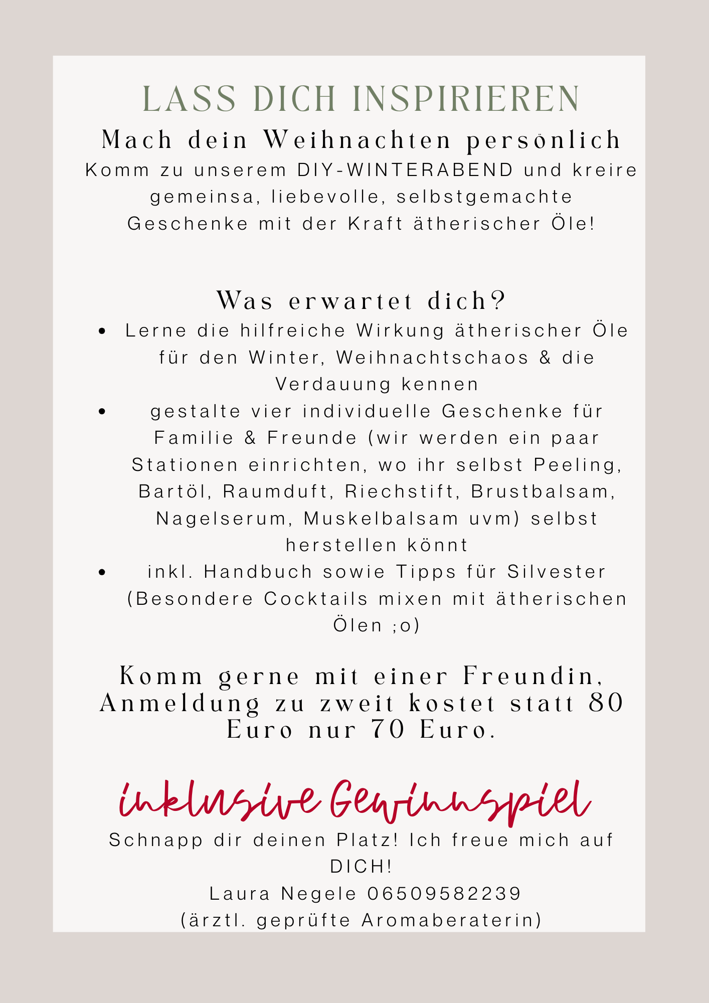 Komm zu unserem DIY-WINTERABEND und kreire gemeinsam, liebevolle, selbstgemachte Geschenke mit der Kraft ätherischer Öle!